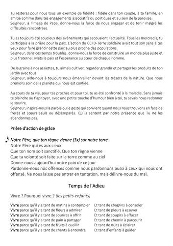 Ses funérailles ont eu lieu le samedi 10 janvier en l'église saint Martin à Cuincy devant une assemblée nombreuse et priante. Cela a été une célébration pleine de confiance et d''espérance présidée par Yves-Marie Carpentier et Jean-Maurice Castelain.